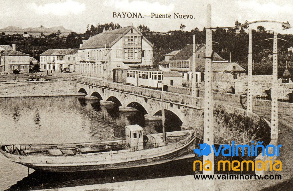 Postal da Serie Grafos co título «Bayona – Puente Nuevo». Nesta tarxeta apréciase o tranvía sobre a ponte nova. En primeiro termo podemos ver unha gabarra de considerables dimensións.
