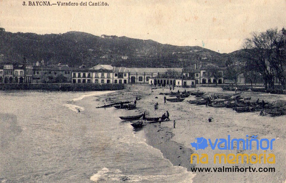 Postal Nº 3 da Serie de Amalio Couto Pacheco titulada “Bayona – Varadero del Cantiño”. Recolle esta postal a praia da Ribeira, onde aparece un grande número de botes na área. Esta zona de Baiona dedicábase ás tarefas relacionadas coa pesca, ao fondo vese a Praza do Pescado e xusto detrás a fábrica de conservas e salgado.