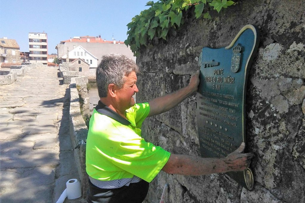 Despois dos traballos de limpeza, operarios da Concellería de Vías e Obras de Baiona procederon este martes a instalar a primeira das sinales recuperadas. Trátase dunha placa de bronce coa inscrición da ponte románica na que faise constar a historia da súa construción, obra de San Pedro González Telmo, sobre a vía romana “Per Loca Maritima”.