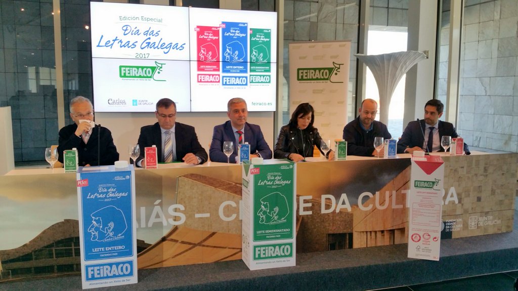 A Secretaría Xeral de Política Lingüística colabora con Feiraco nesta campaña na que a cooperativa láctea galega personaliza e distribúe un millón de envases conmemorativos das Letras Galegas 2017 das tres referencias do seu leite (enteiro, semidesnatado e desnatado), por medio dunha edición especial en cuxo frontal leva integrada unha ilustración orixinal cun retrato do autor homenaxeado, Carlos Casares, cedida exclusivamente pola fundación que leva o seu nome e que é depositaria do seu legado para realizar esta acción.