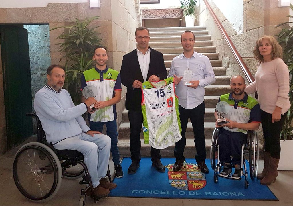 O Concello de Baiona homenaxeou este mércores aos dous xogadores miñoranos do Club Amfiv que o pasado 30 de abril proclamáronse campións de Europa de baloncesto en cadeira de rodas no torneo celebrado en Vigo. O alcalde de Baiona, Ángel Rodal, e os concelleiros de Accesibilidade, Policarpo Vilar, e Deportes, María Jesús Martins, recibiron a Berni Costas e Julio Vilas, que estiveron acompañados polo presidente do club Amfiv, José Antonio Beiro.