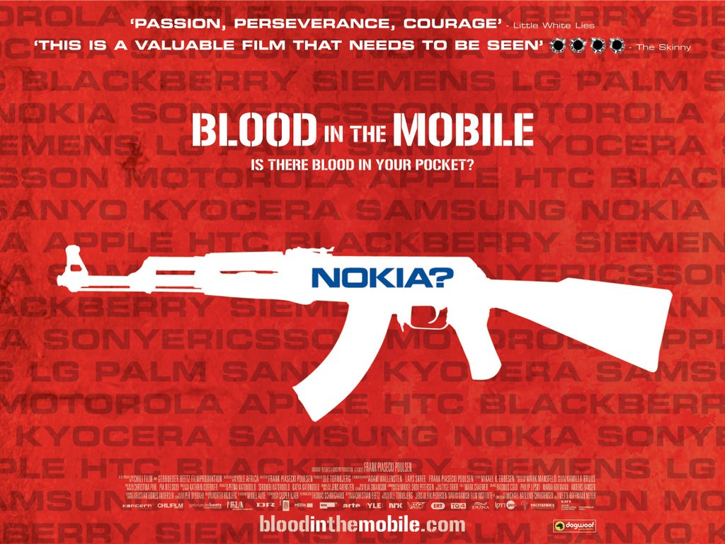 Por su parte, el documental danés «Blood in the mobile» («Sangre en el móvil») ponen el foco en la deuda ecológica abordando el conflicto de la extracción ilegal de coltán en el Congo, mineral empleado fundamentalmente en la construcción de aparatos electrónicos como los móviles y del que este país centroafricano es el primer productor mundial. Sin embargo, el negocio del coltán, en lugar de ser una fuente de riqueza para el país, a menudo beneficia a los grupos armados que controlan las minas, donde es cotidiano el trabajo forzado y la explotación infantil. Así, a pesar de que la República Democrática del Congo tiene una de las reservas de coltán más ricas del mundo, queda muy al margen del nivel de desarrollo de los países occidentales: en España la combinación de teléfonos fijos y móviles excede los 150 teléfonos por cada 100 personas; en la R.D. del Congo por el mismo número de personas sólo hay 48.
