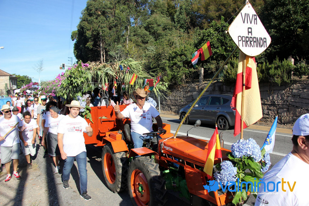 El multitudinario grupo de peregrinaje, formado fundamentalmente por gente de Vilariño pero también de otras parroquias de Nigrán, se reunió a las 9.00 de la mañana frente al Ekomax de A Ramallosa, donde tras echar los consabidos cohetes, salió a las 9.30 horas. Cuatro tractores y un camión completamente engalanados con flores cargaron a los niños y mayores, las viandas y el vino, mientras que otro vehículo llevó en una plataforma una empanada de 3×4 metros y 80 kilos de peso donada por el taller nigranés Tupana (todos los que compraron la camiseta de este año pudieron degustarla a su llegada a mediodía a Morgadáns). La comitiva fue acompañada durante todo el trayecto por la Policía Local de Nigrán y después la de Gondomar.