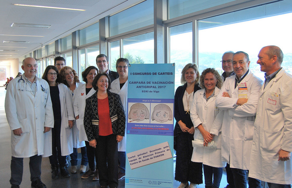 O xerente da EOXI de Vigo, Félix Rubial, xunto con parte do seu equipo directivo, visitou o centro de saúde de Panxón para felicitar aos seus profesionais, que gañaron o premio do I Concurso de Carteis da Campaña de Vacinación Antigripal 2017. O cartel é a imaxe institucional da campaña deste ano na área sanitaria de Vigo. Ademais, o xerente aproveitou para vacinarse e promover así a vacinación entre os profesionais sanitarios, que son un do colectivos obxecto da campaña.