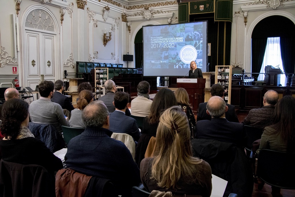 La presidenta de la Diputación de Pontevedra, Carmela Silva, acompañada de diputadas y diputados provinciales, de alcaldes y alcaldesas, y de representantes de la Xunta de Galicia así como de diferentes campos del sector turístico de Pontevedra, dio a conocer esta mañana los principales objetivos y líneas de actuación que conforman el Plan Estratégico de Turismo “Turismo 2020 Pontevedra”. En líneas generales, este novedoso plan, desarrollado a partir de las demandas del sector turístico provincial, cuenta con 400 páginas en las que se detallan las cinco líneas estratégicas sobre las que se desarrollarán 11 planes de actuación específicos con 40 acciones diferenciadas que se pondrán en marcha nos próximos tres años.