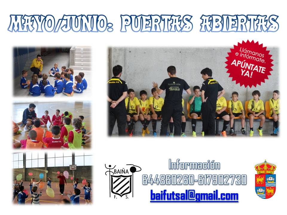 O Baíña Fútbol Sala abre as portas dos seus adestramentos para todos os nenos e maiores que desexen probar nos seus equipos. Durante o mes de maio nos horarios habituais de adestramento poderán probar todos os nenos e maiores que desexen participar neste apaixonante deporte.