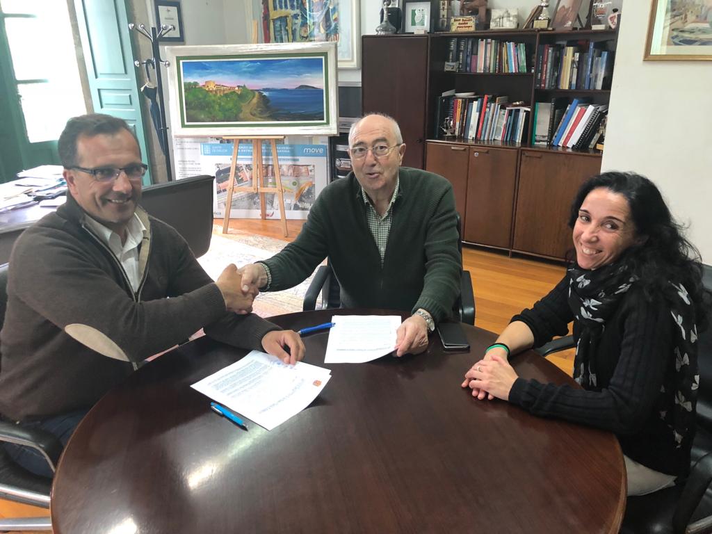 Ángel Rodal, en representación del Concello de Baiona, acompañado por la Concejala de Bienestar Social, Mª Carmen Paredes, y Jose Santoro Pumarega, en representación del Centro Juan María, firmaron un convenio de colaboración que permitirá que 15 alumnos disfruten del programa «Ocio para todos».