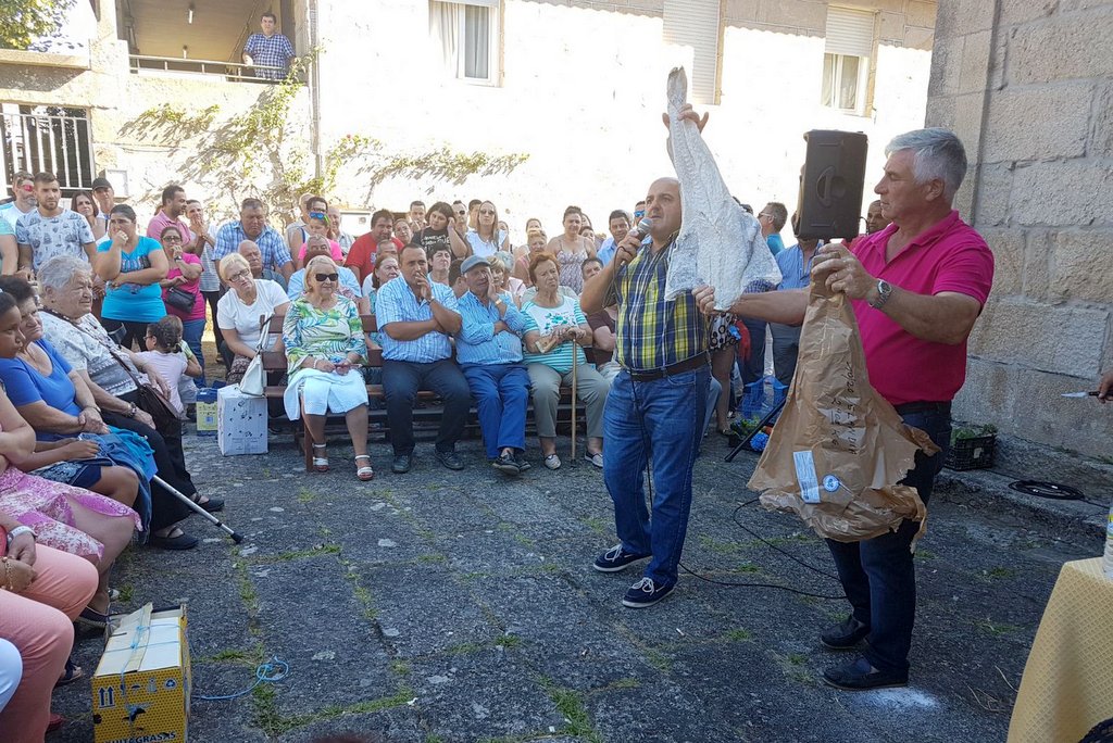 Durante a xornada os presentes poxarán por produtos tales como froitas, diferentes partes do porco en salgadura, chourizos, xamón, hortalizas, patacas, verdura ademais de animais vivos. Riveiro explicou que polos galos chega a ofrecerse ata 50 euros por peza e polos pitos e coellos entre 20 e 25 euros. Conta tamén con algunha folla de bacallau de 5 quilos de peso e que en anos anteriores chegou despacharse por 100 euros. Pero ademais e como manda esta tradición teñen reservadas sorpresas tales como cordeiros e ovellas, aínda que estes só se dan a coñecer ao comezo da poxa. «Tráennolos sen avisar, desta maneira tamén mantemos un pouco a incerteza e son moitos os que se animan a vir para descubrir de que se trata», explicou. Con todo e a pesar de que na maioría de casos teñen coñecemento dos produtos para poxar sempre aparecen novidades de última hora por exemplo gatos.