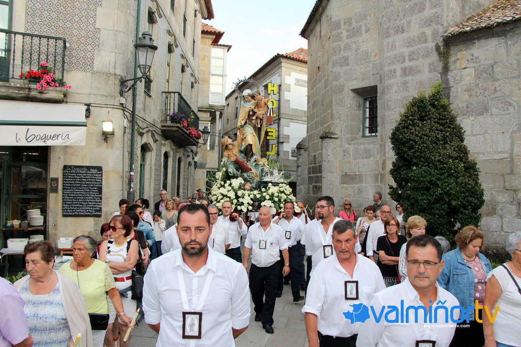 Xa finalizada a Eucaristía, saía do templo parroquial a imaxe da patroa dos mariñeiros acompañada pola Banda de Música de Baiona e centos de devotos. A comitiva completou o percorrido habitual polas rúas de Santa Liberata, Manuel Valverde, Conde, Ventura Misa e Carabela Pinta, onde se interpretou a Salve Mariñeira, para continuar despois por Marqués de Quintanar.