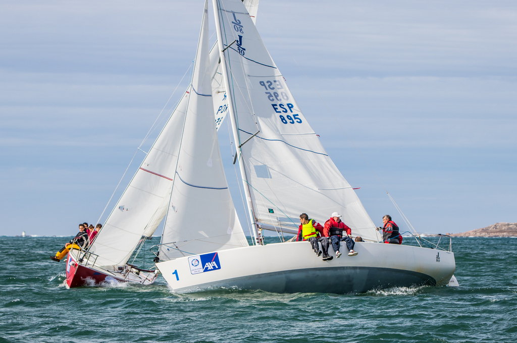 Farao nunha xornada que se prevé complicada por mor da meteoroloxía, que anuncia algo de choiva e ventos de máis de 15 nós con picos próximos aos 30, unhas condicións que farán “voar” aos J80 na baía de Baiona.