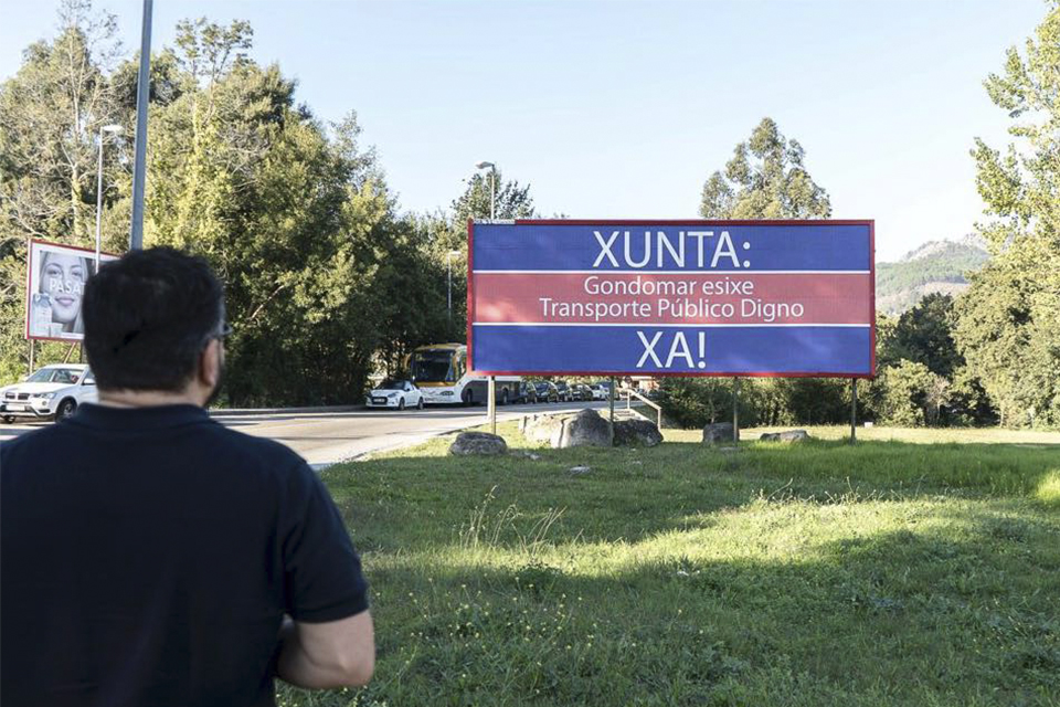 Entre esas iniciativas, el Ayuntamiento de Gondomar, consensuadamente con la Plataforma de Afectados, decidió colocar una valla publicitaria con la leyenda “Xunta: Gondomar esixe Transporte Público Digno XA!”, hecho por el cual, la administración autónoma denuncia al alcalde, por considerar que dicha publicidad es falaz, tendenciosa, que menoscaba, obstaculiza y perturba el poder político autonómico al dar una información sesgada, no veraz a los ciudadanos, considerando la colocación de dicha valla una deslealtad institucional, recurriendo a la vía judicial contra el alcalde para evitar daños y perjuicios irreparables (por verse dañada la imagen del gobierno popular), solicitando la inmediata retirada de dicha valla publicitaria.