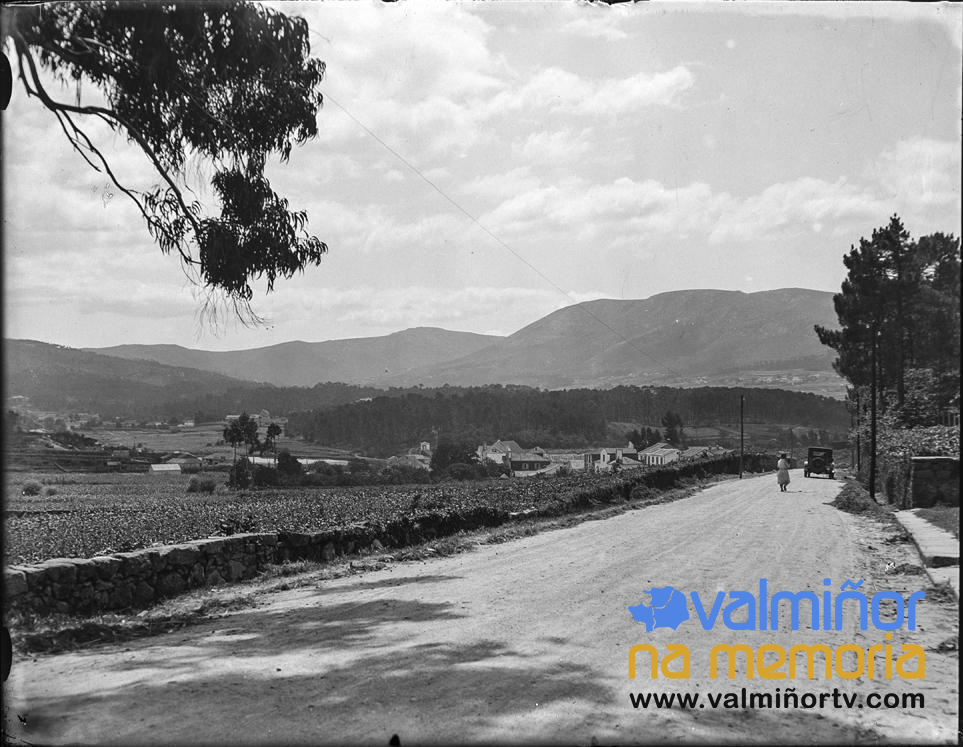 Fotografía de Otto Wunderlich (1886-1975) tomada entre 1929 y 1936 en San Pedro de A Ramallosa, Nigrán, titulada “Tal von Ramallosa” (Valle de Ramallosa). En el camino, coche circulando y detrás una mujer andando. A la derecha árboles y a la izquierda cultivos, casas y montañas con profusa vegetación.