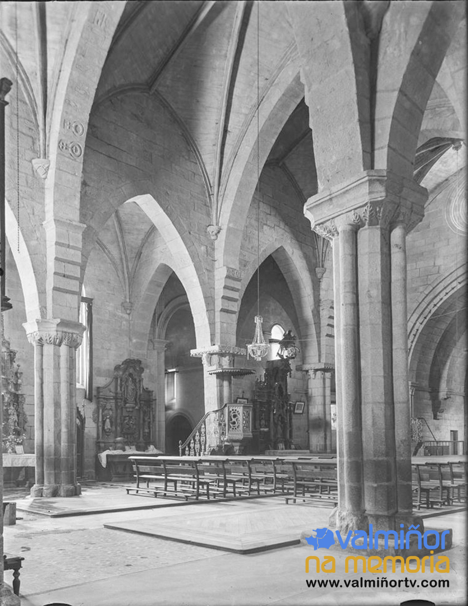 Interior de la Colegiata de Santa María de Baiona, con bóvedas de crucerías, columnas adosadas a los pilares centrales, púlpito y pequeño altar a la izquierda y bancos para el oficio religioso. Fotografía de Otto Wunderlich (1886-1975) tomada entre 1929 y 1936.