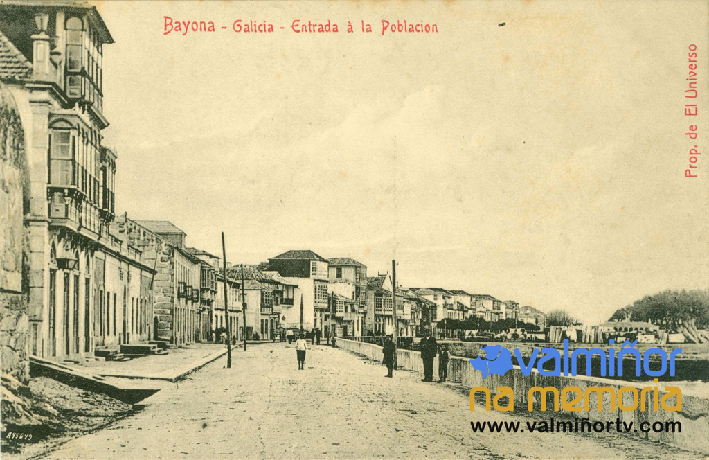 Tarxeta postal Nº A-45649 da Serie “Unión Postal Universal” titulada “Bayona (Galicia) – Entrada a la Población”. Atopámonos ante unha Serie realizada pola tenda de ultramarinos “El Universo”, situada no paseo de Elduayen. Ademais desta serie, este comercio editou outra. Son dúas series de grande tipismo, das cales a primeira está numerada, polo que podemos saber que se editaron polo menos quince postais; pola contra, da segunda é difícil saber cantas visitas tiña. Estas postais deberon editarse na segunda década deste século. No anverso da primeira serie aparecía a lenda “Unión Postal Universal”, pero non así na segunda.