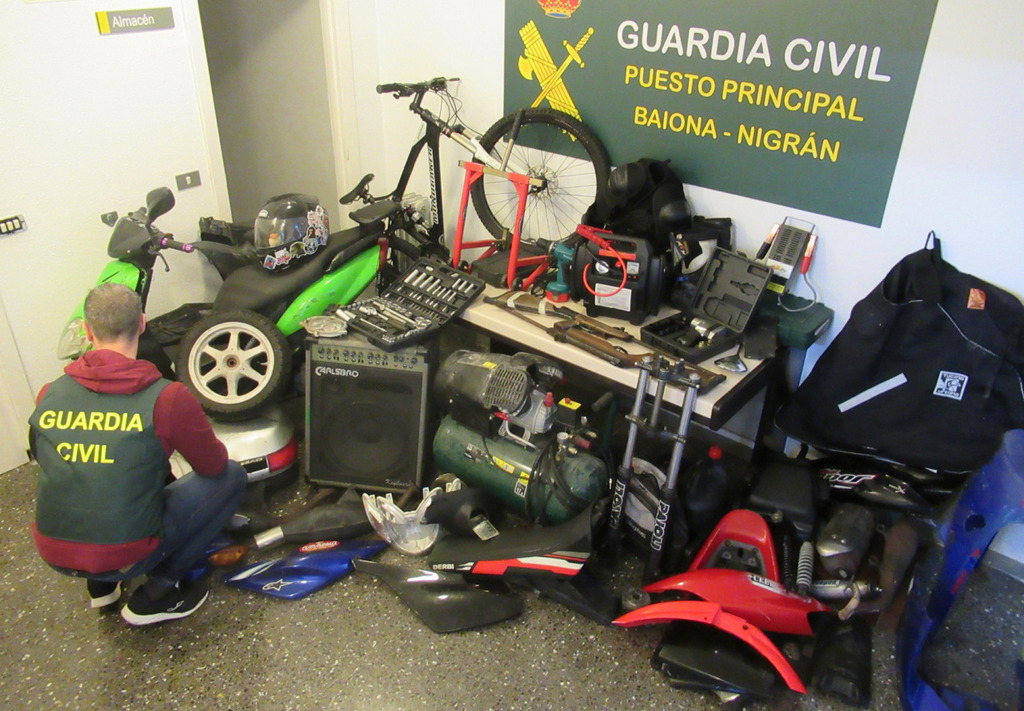 Entre os efectos recuperados atopábanse a práctica totalidade dos obxectos que foran roubados no anexo da vivenda de Nigrán, que foi un dos roubos esclarecidos de maior entidade. Localizáronse tamén varios ciclomotores despezados, bicicletas, ferramentas que se utilizan nos talleres mecánicos e complementos propios do vestiario dos motoristas.
