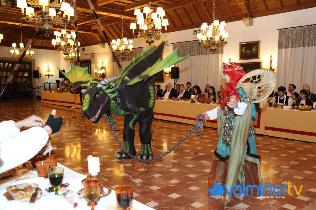 Alrededor de 150 comensales disfrutaron de una cena compuesta por caldito de Pedro Madruga, asado de cochinillo con fritos de calabaza, empanada de raxo, la fruta del Monterreal y los postres del medioevo (las filloas del Tío Remigio, Tarta del Conde y Almendrados del Convento de la Anunciada), todo acompañado por el vino de la Bodega del Castillo y Agua de las Pasasiñas. Tampoco faltaron los “Ñoclos de Pinzón”, la “Tarta de Sarmiento” y las Rosquillas Cristaleiro, para finalizar con una Queimada.