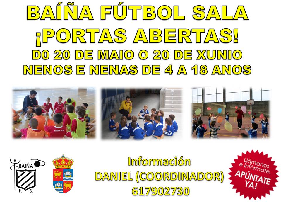 O club de fútbol sala Baíña pon en marcha a súa campaña de «portas abertas aos seus adestramentos», unha vez acabadas as ligas regulares o club seguirá adestrando en distintos pavillóns de Baiona para preparar os torneos de verán e a próxima tempada. Todos os nenos ou adultos que se queiran achegar aos seus adestramentos poderano facer gratuitamente desde o 20 de maio ao 20 de xuño. Para máis información contactar co coordinador deportivo Daniel Álvarez no teléfono 617 902 730 e xa lles informan dos horarios. O club conta con adestradores titulados (Inef e Nivel III Nacional), monitores de fútbol sala para garantir a mellor formación deportiva.