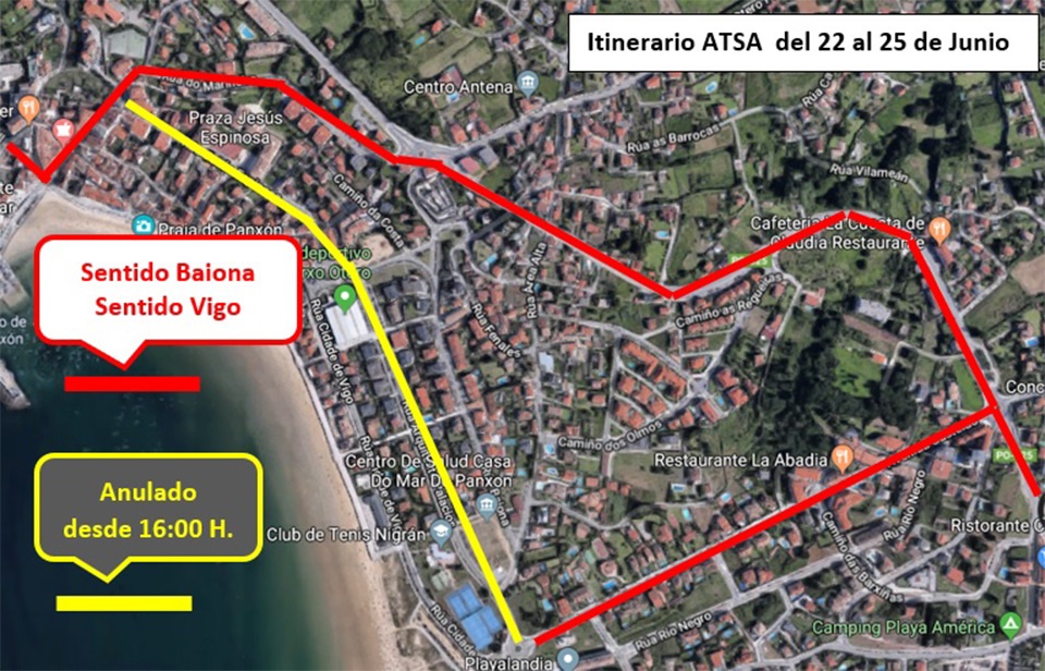 O Concello de Nigrán informa que durante as festas de Panxón, do 22 ao 25 de xuño, a parada do autobús ATSA do Pavillón Municipal quedará anulada dende as 16:00 horas en diante. O percorrido desde esa hora en sentido Baiona será por rúa Mariñeiro cara a Estrada pola Vía e Avda. Castelao; e en sentido Vigo, dará volta en Castelao, regresará por Estrada pola Vía e baixará por Mariñeiro.