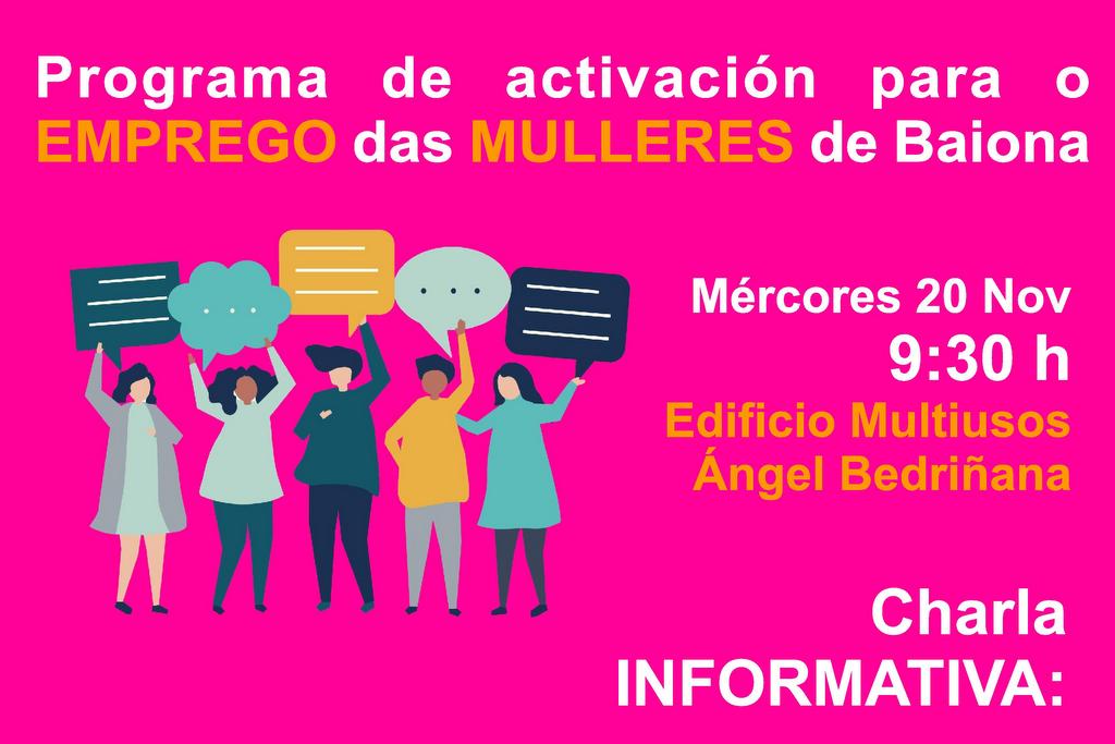 O Concello de Baiona organiza unha charla informativa para desempregadas, sobre qué buscan as empresas e o papel das ETTs. Este é o nome da charla informativa que impartirá un responsable de Adecco este mércores ás 9:30 horas no Multiusos Ángel Bedriñana, no marco do programa de activación para o emprego das mulleres do Concello de Baiona.