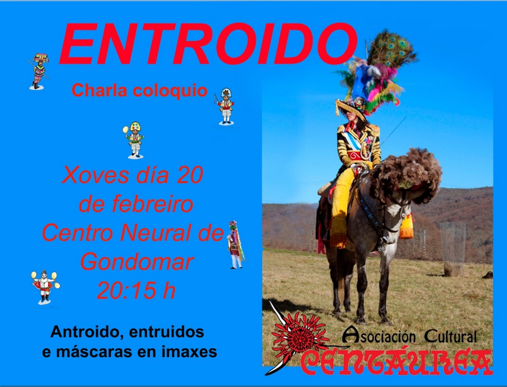 Este xoves día 20 de febreiro, ás 20:15 horas, no Centro Neural de Gondomar e organizado pola Asociación Cultural Centáurea dentro das celebracións do Entroido, terá lugar un acto consistente na presentación de imaxes do Entroido galego, que será comentada e participada polo público asistente.