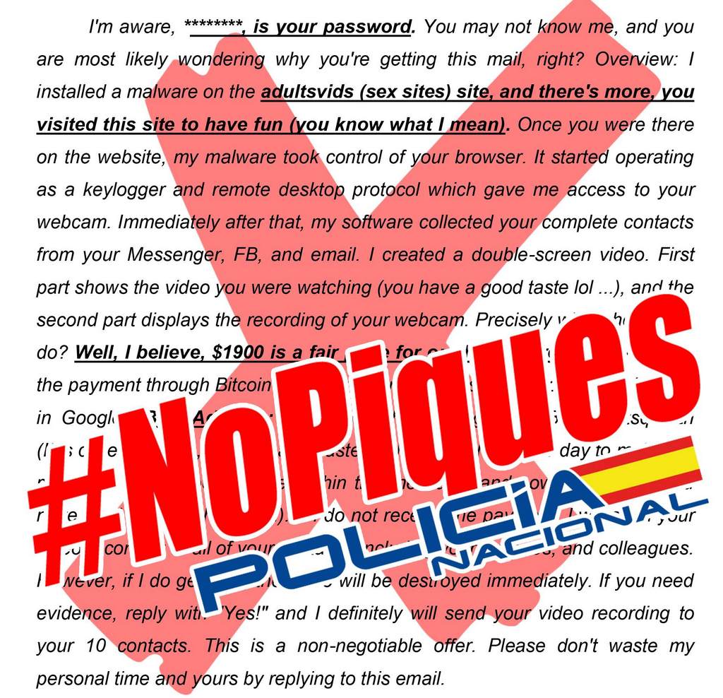 A Policía Nacional alerta dunha campaña masiva de intentos de ciberestafa mediante sextorsión. Os axentes especializados en loitar contra a ciberdelincuencia detectaron que, con motivo do confinamento motivado polo Estado de Alarma, produciuse un incremento significativo de casos desta variedade de chantaxe online. En apenas catro días, máis de 1.000 cidadáns recibiron correos electrónicos nos que trataban de cometer a estafa. A Policía Nacional dispón da conta de correo redesabiertas@policia.es, onde os ciberaxentes reciben numerosas comunicacións diarias sobre posibles casos que son analizados de forma individualizada.