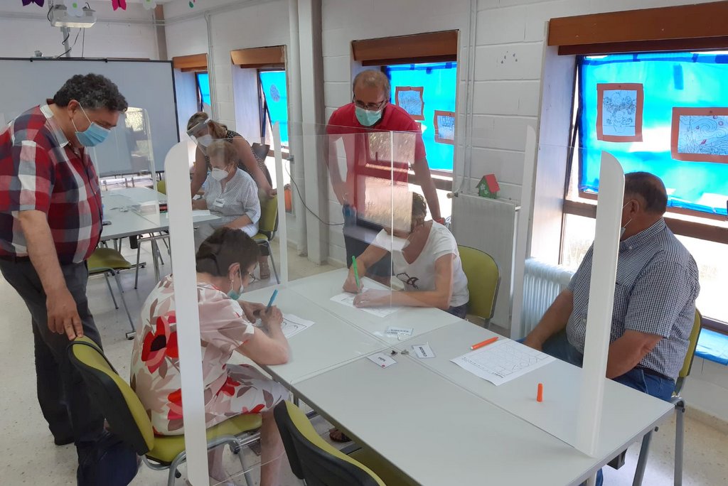 Así, las instalaciones tuvieron que ser acondicionadas para poder retomar la actividad grupal, ya que además se trata de personas de alto riesgo al superar todos los 70 años. De este modo, se separaron las mesas mediante metacrilatos guardando las distancias de seguridad y en la entrada se situó un dispensador de gel hidroalcólico, paralelamente, los terapeutas les toman y anotan la temperatura a su llegada, además de emplear mascarillas hasta estar situados en sus puestos (los trabajadores la llevan en todo momento).
