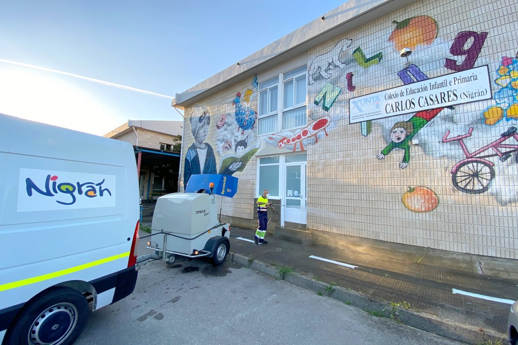 O Concello de Nigrán, a través da empresa municipal da limpeza, CESPA, iniciou esta semana os labores de desinfección na contorna dos colexios, coincidindo co inicio do curso escolar, e noutras zonas máis sensibles como as marquesiñas onde os nenos esperan o autobús e son moi concorridas. Estes baldeos véñense desenvolvendo desde o inicio da alarma sanitaria polo COVID 19 pero refórzanse neste momento de tanta incerteza para as familias e comunidade educativa.