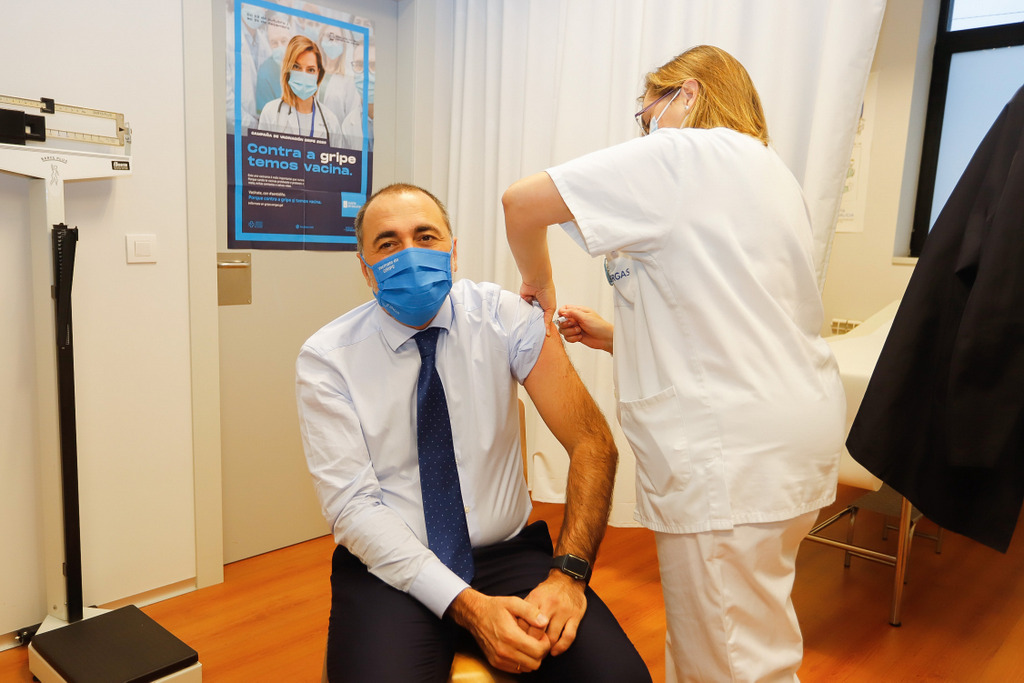 El conselleiro de Sanidad, Julio García Comesaña, acudió esta mañana a vacunarse de la gripe en el centro de salud de Lavadores de Vigo, dentro de la campaña de vacunación que está llevando a cabo su departamento para protegerse contra esta enfermedad. Comesaña destacó que vacunarse frente a la gripe este año tiene una especial relevancia, ya que en el contexto de la pandemia por el COVID pueden coincidir ambas infecciones, de ahí la importancia de la vacunación antigripal de las personas en riesgo y la reducción de la carga de esta enfermedad.