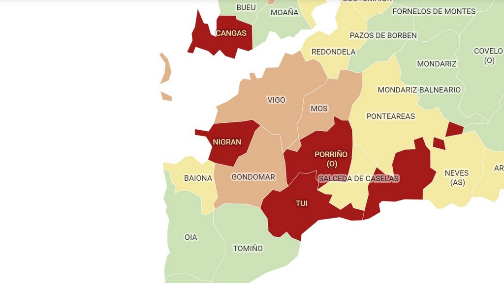Segundo os datos publicados este xoves pola Dirección Xeral de Saúde Pública da Consellería de Sanidade, Nigrán volver a estar en nivel de alerta 3, o que significa segundo o semáforo de cores que utiliza a Xunta que nos últimos 7 días foron confirmados por PCR máis de 21 casos. Gondomar mantense en nivel de alerta laranxa, polo que terían sido confirmados por PCR entre 14 e 21 casos nos últimos 7 días. Baiona está en nivel de alerta 1 desde o luns, con entre 7 e 14 casos confirmados por PCR nos últimos 7 días.