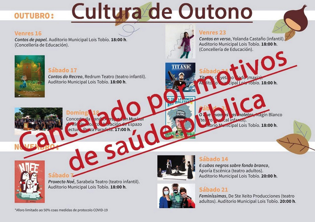 Ante as novas recomendacións emitidas polo Comité Clínico do SERGAS, que decretou o nivel 2 en toda a comunidade desde a media noite do xoves, e o continuo incremento de contaxios en todo o país, o Concello de Gondomar suspende os actos programados no seu programa “Cultura de Outono”. Gondomar aposta pola prevención e apela á responsabilidade social como ferramentas básicas para frear o incremento de casos e frear a curva que está rexistrando un sentido ascendente nos últimos días.