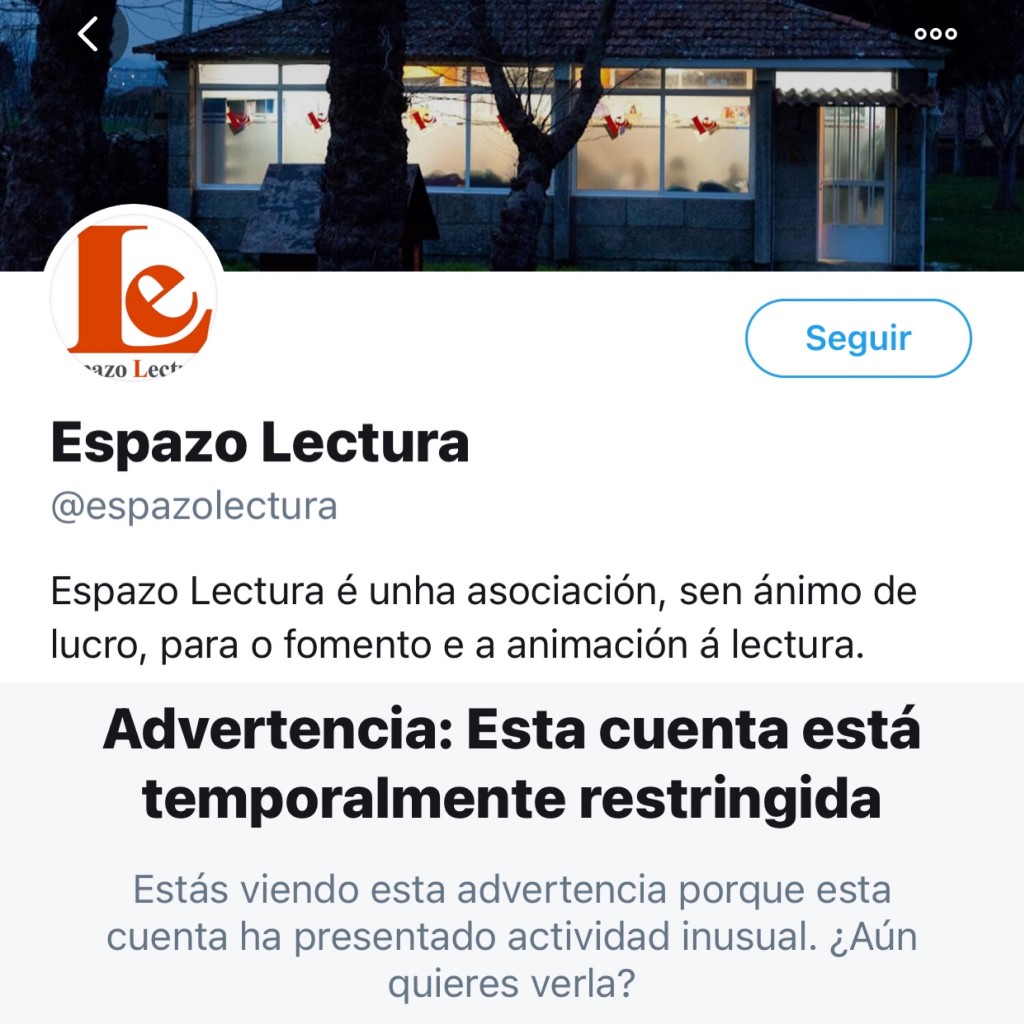 El día 2 de octubre Twitter suspendió la cuenta de Espazo Lectura en esta red porque parece ser que detectaron una utilización inusual de la misma. “Espazo Lectura es una asociación sin ánimo de lucro de fomento de la lectura y siempre hacemos publicaciones que tienen que ver con los libros, la lectura y nuestras actividades”, aseguran desde la asociación de Gondomar.