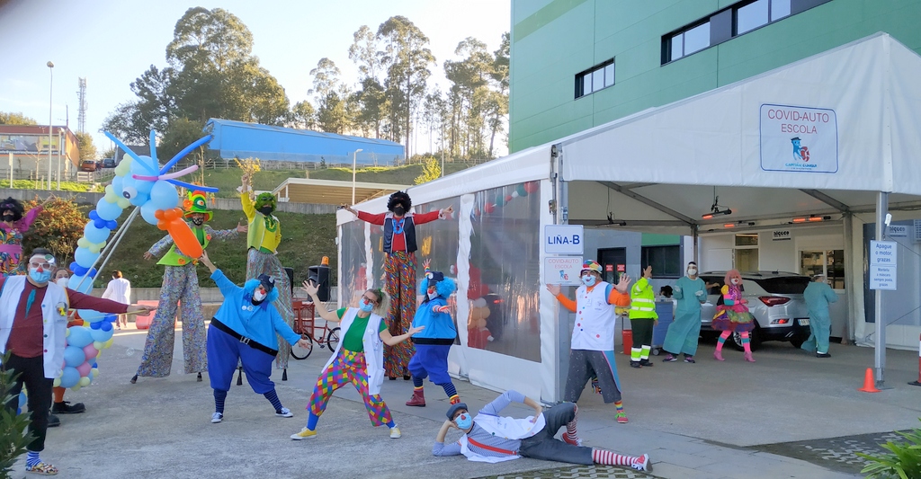 La Asociación Galiclown Pallasos de Hospital visitó hoy el Covid-Auto Escuela del Álvaro Cunqueiro para entretener a los niños y niñas y hacerles más fácil a realización de la prueba PCR. Además, realizaron un pasacalles por el exterior del hospital para animar a los pacientes hospitalizados, y agradecer con sonrisas al personal su labor durante esta pandemia.