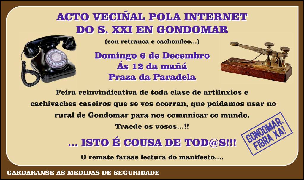 A Plataforma Gondomar Fibra Xa! convoca un evento na carpa da Praza da Paradela para este domingo 6 de decembro ás 12:00 horas, co ánimo de presionar á empresa Movistar, perceptora de subvencións públicas, para que avance nas negociacións para desbloquear dunha vez por todas o tramo de alimentación cos particulares implicados.