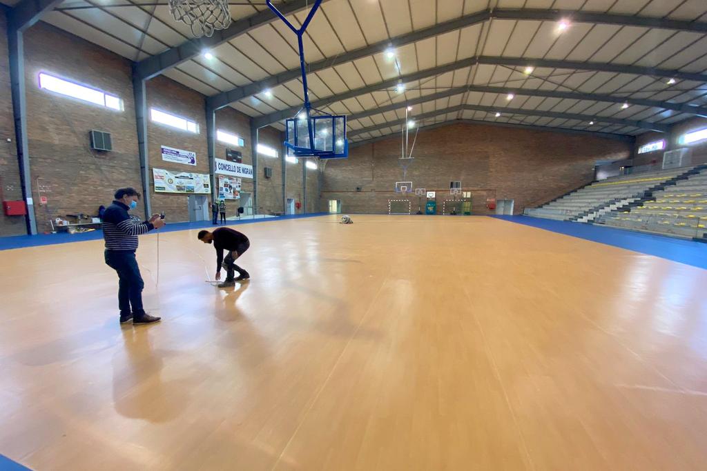 Este pavimento sintético deportivo cubre toda la pista de 40×20 metros, siendo el interior en color imitación madera y el exterior azul. A misma fue marcada para fútbol sala y balonmano, basket y mini-basket, teniendo el escudo del Ayuntamiento en el centro y las letras Ayuntamiento de Nigrán en los laterales. Sus ventajas frente a otras soluciones son la adaptabilidad a las diferentes disciplinas deportivas, durabilidad y mínimo mantenimiento.