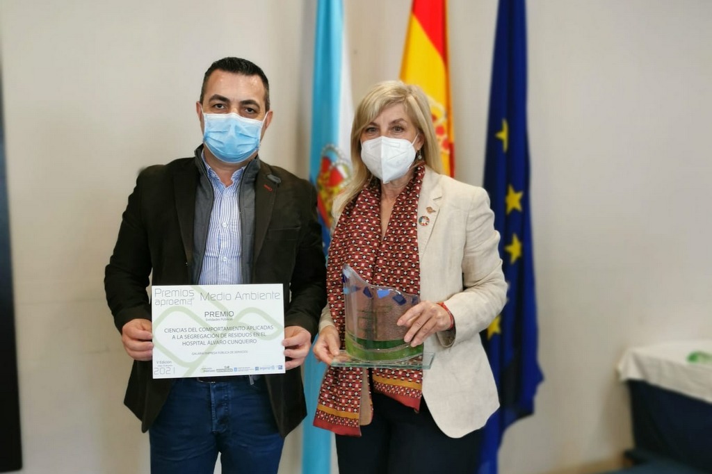 La Asociación Profesional de empresas medioambientales de Galicia- APROEMA, reconoció un proyecto del SERGAS como el de la mejor entidad pública que está trabajando a favor de la conservación del Medio ambiente. Se trata del proyecto de “Ciencias del Comportamiento aplicadas a la segregación de residuos en el hospital Álvaro Cunqueiro”. Recogieron el premio el subdirector de enfermería del Área Sanitaria de Vigo, Xoan Hermelo, y la técnica de Innovación y Sostenibilidad de Galaria, Beatriz Piñeiro.