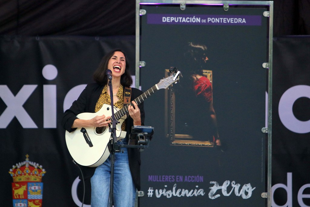 Con un espectacular atardecer y frente al mar de Baiona y con el fondo de las Islas Cíes, la poesía, la voz y la música se unieron en la noche de este lunes en “Palabr(A)”, la actuación con la que Najla Shami hizo un llamamiento claro, emotivo, dulce y vibrante por la igualdad en el baionés parque de la Palma. Con temas con un marcado corte feminista, en los que también dejó ver la protesta social y la fusión de culturas, la artista removió la conciencia de las personas asistentes a este concierto del programa “Mujeres en Acción. Violencia Zero” al que asistieron la presidenta, Carmela Silva, el alcalde de Baiona, Carlos Gómez, la diputada provincial, Raquel Giráldez, y representantes de la corporación local. Todas ellas y ellos se dejaron llevar por las músicas del mundo, corearon algunos de los temas, aplaudieron y disfrutaron del concierto sin olvidarse del motivo que las y los llevó allí: la erradicación de la violencia de género.