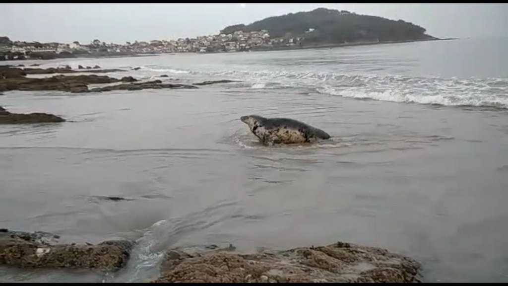 Foi avistado por primeira vez o sábado pasado en Vigo, cando levantou unha enorme expectación na praia de Canido, pouco antes das tres da tarde. Tamén o luns volveu pasearse por outro areal da ría, entre Patos e Saiáns. E agora repetiu fazaña ante a mirada de decenas de bañistas.