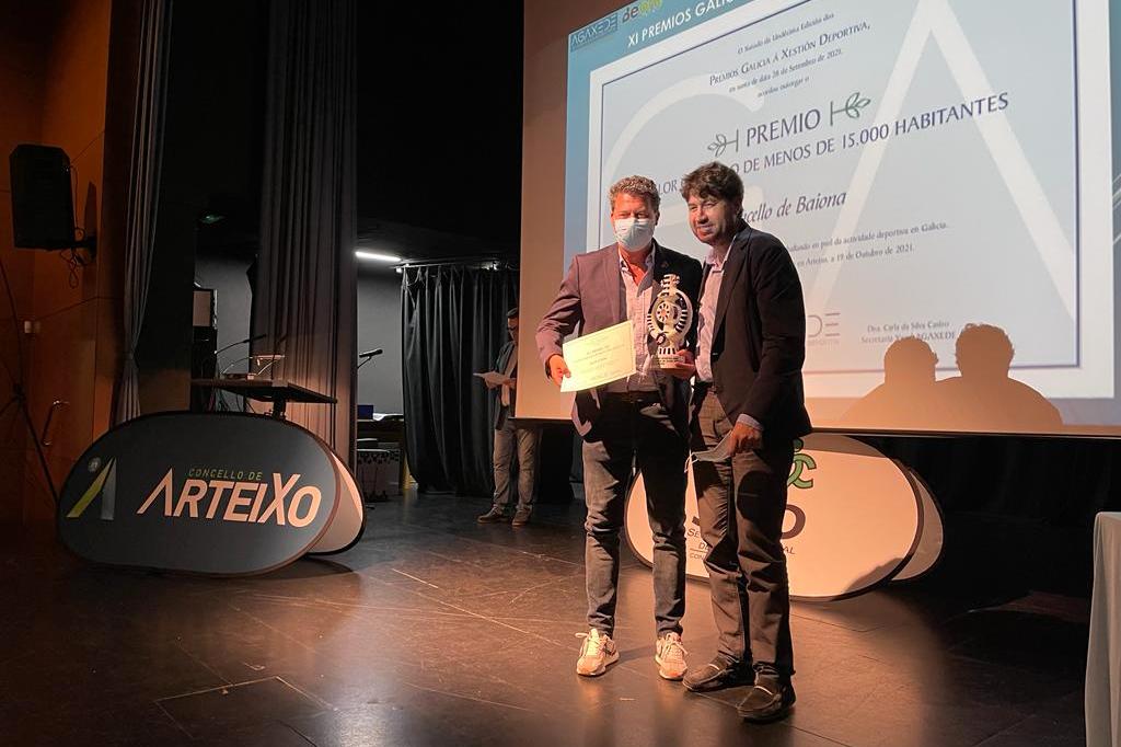 O Alcalde de Baiona, Carlos Gómez, recolleu o premio ao mellor concello de Galicia en xestión deportiva na categoría de municipios de menos de 15.000 habitantes na gala anual dos Premios Galicia á Xestión Deportiva que celebrou onte a Sociedade Galega de Xestores Deportivos (Agaxede) en Arteixo. O rexedor acudiu acompañado da concelleira de Deportes, Miriam Costas, e o técnico municipal do departamento, Javier López.