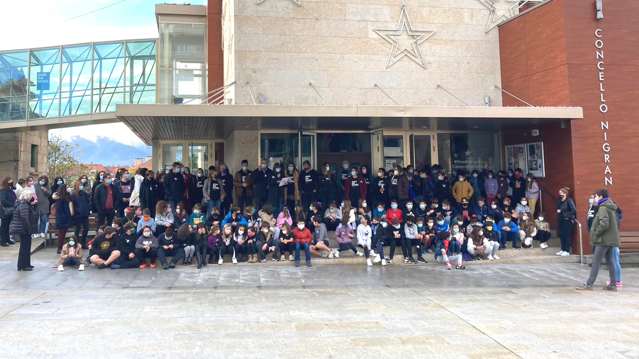 El Ayuntamiento de Nigrán conmemoró un año más el 25-N, Día Internacional de la Eliminación de la Violencia contra las Mujeres, con la lectura pública de un manifiesto en la entrada del Auditorio Municipal y la campaña “NonDáIgual”, diseñada ex-profeso para el municipio por el artista gráfico David Sierra. Así, la iniciativa del Centro de Información a las Mujeres (CIM) cerca de 150 establecimientos comerciales y entidades del municipio lucen esta cartelería y “visten” esta semana sus escaparates de negro en señal de luto por las víctimas de maltrato y de lila por el resurgir de las mujeres que se levantan contra la violencia. Paralelamente, y como cada año, la edil de Educación, Marina Vidal, leyó públicamente a las 11:00 en la Plaza del Ayuntamiento un manifiesto arropada por decenas de vecinos, la corporación municipal, trabajadores del Ayuntamiento y alumnado del CEIP Humberto Juanes. Todos juntos guardaron un minuto de silencio en homenaje a las víctimas.