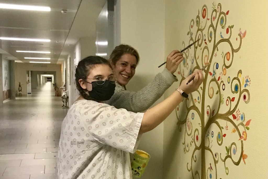 La artista desarrolló varias actuaciones pictóricas tanto en las paredes del aula como en algún corredor de la Unidad de Hospitalización pediátrica. “El objetivo era crear un espacio cálido para que los niños y niñas, sus familiares y los profesionales disfruten de un entorno de creatividad, con alusiones a la lectura, música, pintura así como a los animales y naturaleza, para que relativicen el proceso de su enfermedad y los acompañe la alegría del arte durante su ingreso hospitalario. Mientras pintaba, varios menores ingresados se acercaron de manera espontánea y quisieron participar, lo que me permitió acercarme a ellos y observar la magia del poder terapéutico de la pintura”.