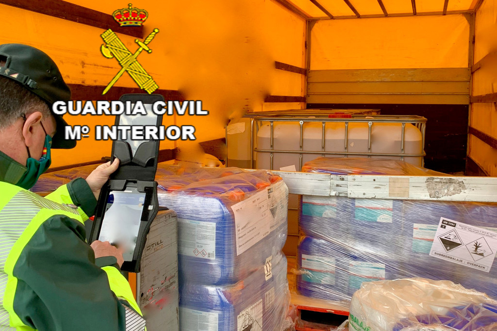 Tras ser detenido e inspeccionado, se comprobó que transportaba 5 recipientes industriales (GRG) con vino y tres palets de plástico retractilado de mercancías ADR concretamente de la clase 8, grupo de embalaje 3 (hipoclorito), sin anclar de forma efectiva para evitar su desplazamiento longitudinal o lateral. Los Guardias Civiles verificaron que los cinco GRG se encontraban en el costado izquierdo, tras haberse desplazado de su ubicación inicial, circunstancia que comprometía la estabilidad del vehículo.