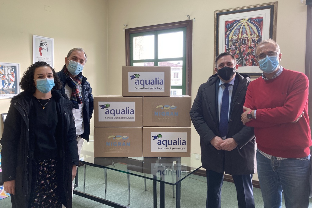 O Concello de Nigrán doará grazas á empresa concesionaria Aqualia un total de 10.500 máscaras hixiénicas para a poboación dos campamentos de refuxiados saharauís. O delegado de Aqualia en Galicia, Javier García; o xefe de Produción, David Soneira, e a responsable de planta en Nigrán, Marían Lago, fixeron hoxe a achega no Concello. O propio alcalde e presidente do Fondo Galego de Cooperación e Solidariedade, Juan González, fará a entrega ao desprazarse esta semana próxima ao territorio arxelino dentro da viaxe organizada por Solidariedade Galega co Pobo Saharauí. Adicionalmente, o rexedor levará tamén por parte do Concello 200 camisetas e 20 kg de caramelos.