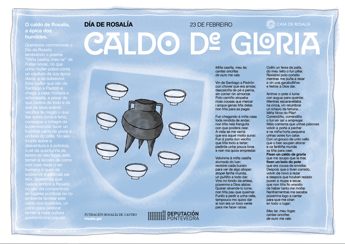 A Deputación de Pontevedra, a través do departamento de Lingua, vai distribuír entre 33 concellos da provincia manteis divulgativos sobre o “Caldo de Gloria”, unha receita humilde que Rosalía de Castro menciona no poema “Miña casiña, meu Lar” do Libro Follas Novas. A iniciativa, que se desenvolve da man da Fundación Rosalía de Castro, pretende poñer en valor tanto a lingua galega como a gastronomía tradicional popular.