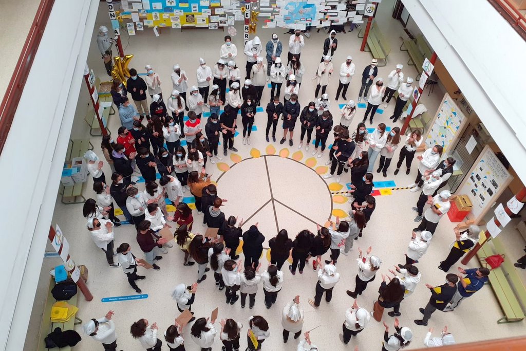 O alumnado, profesorado e persoal non docente do IES Auga da Laxe de Gondomar realizou este venres pola mañá un acto de solidariedade con Ucraína e en contra de todos os conflitos bélicos que hai agora en diferentes lugares do planeta. Foi este acto a actividade central dunha semana intensa de traballo e reflexión co alumnado sobre que a guerra nunca, nunca, pode ser a solución.