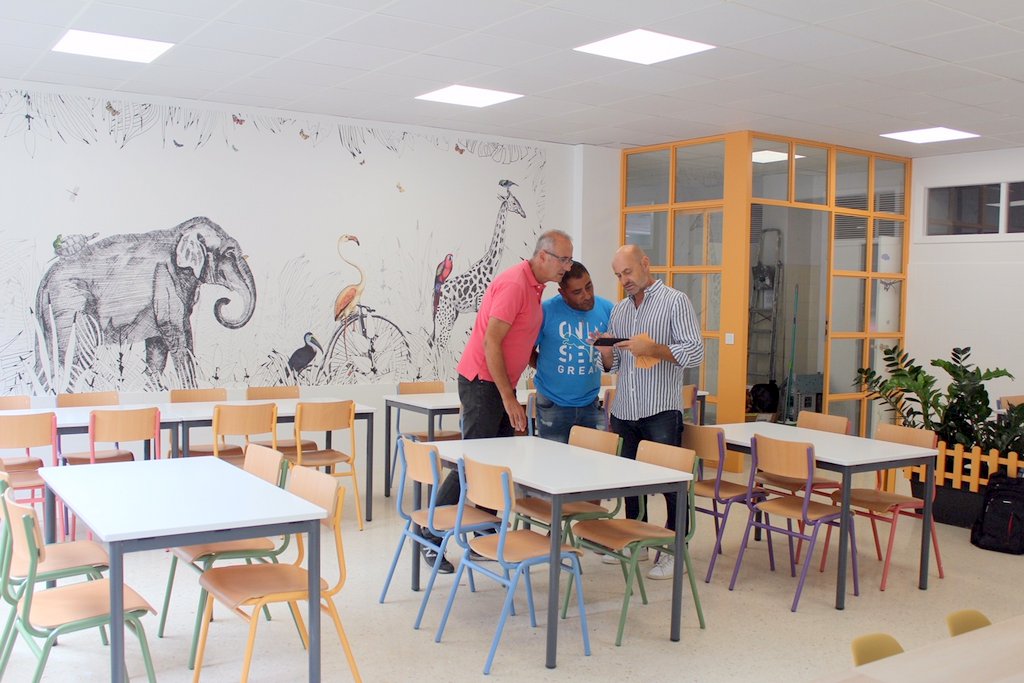 O alumnado do CEIP A Cruz, en Camos, estreou no seu primeiro día de curso un comedor totalmente renovado e acorde á contorna natural deste colexio. Con este obxectivo, o Concello de Nigrán emprendeu este verán obras por valor de 15.000 € a cargo da empresa local Prado Sanromán Interiorismo. Os traballos implicaron deixar o espazo diáfano con portas acristaladas, renovación de todo o mobiliario (lacado de cadeiras e mesas e novas encimeiras e armarios), pulido do chan, novo falso teito con incorporación de luces LED, pintado de toda a habitación con zonas en papel e un gran mural con motivos animais presidindo o espazo, no que tamén destacan as plantas naturais.