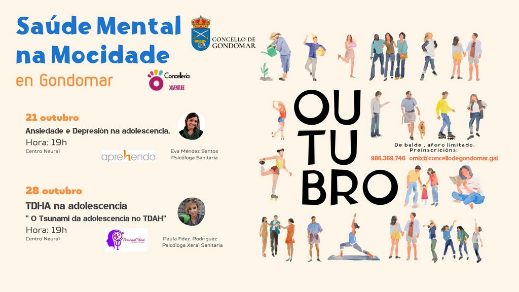 El Ayuntamiento de Gondomar, con motivo del Día Mundial de la Salud Mental, organiza dos charlas que tratarán sobre distintos trastornos que afectan a los adolescentes. La primera de las charlas bajo el título “Ansiedad y depresión en la adolescencia” tendrá lugar el 21 de octubre a las 19:00 horas en el Centro Neural de Gondomar (Policía Local) y correrá a cargo de la psicóloga sanitaria Dra. Eva Méndez Santos, y en ella esta especialista del equipo Aprehendo, hablará de dos trastornos que afectan, según un reciente estudio de UNICEF, al 40% de la población mundial en edad adolescente.