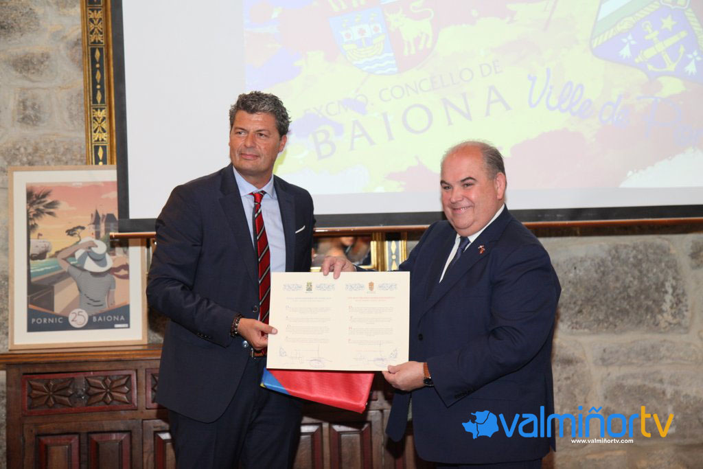 Los Ayuntamientos de Baiona y Pornic celebran el 25º aniversario de la unión entre ambas localidades durante este fin de semana. La jornada más especial para esta celebración tuvo lugar esta misma mañana. El acto oficial de conmemoración del hermanamiento se celebró en el Salón Monterreal del Parador Conde de Gondomar, después de la bienvenida a cargo del Alcalde de Baiona, Carlos Gómez Prado, y el Alcalde de Pornic, Jean Michel Brard. Asimismo, se ratificó el hermanamiento con la firma del acta de renovación. A continuación, se procedió a un intercambio de banderas y de regalos institucionales entre los ayuntamientos. El regidor baionés hizo entrega a su homólogo francés de una silueta de la Carabela Pinta de acero obra de la artista baionesa Irene Silva Xiráldez. El regidor dio la bienvenida resaltando “la importancia de estos proyectos internacionales, ya que aparte de servir para que se conozca Baiona en el exterior, en este caso en Pornic, sirven para afianzar los lazos entre ambos lugares hermanos, muy unidos desde el hermanamiento en el año 1997”.