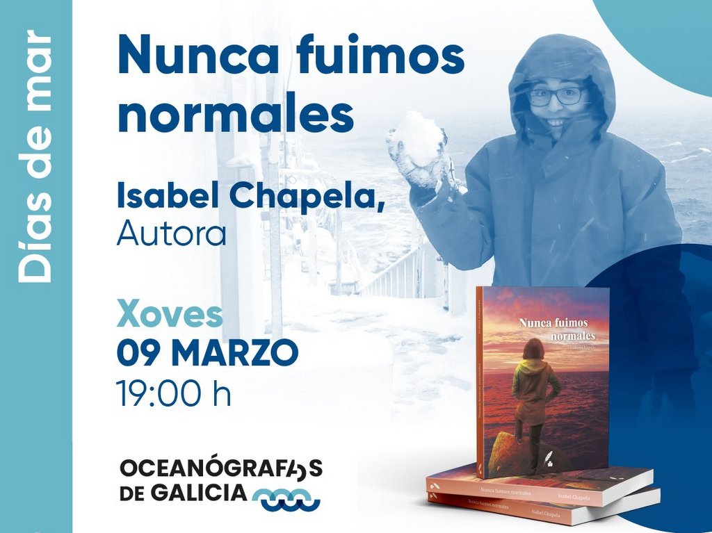 La primera charla de este 2023 tendrá lugar el próximo jueves 9 de marzo de la mano de Isabel Chapela Lorenzo, licenciada en Ciencias del Mar por la Universidad de Vigo, que se asomará a la ventana de “Días de Mar” para presentar su libro “Nunca fuimos normales”. La autora acercará a las y a los espectadores una obra autobiográfica en la que recoge sus reflexiones durante varios años recogiendo muestras biológicas en buques de pesca de altura y participando en diversas campañas oceanográficas.