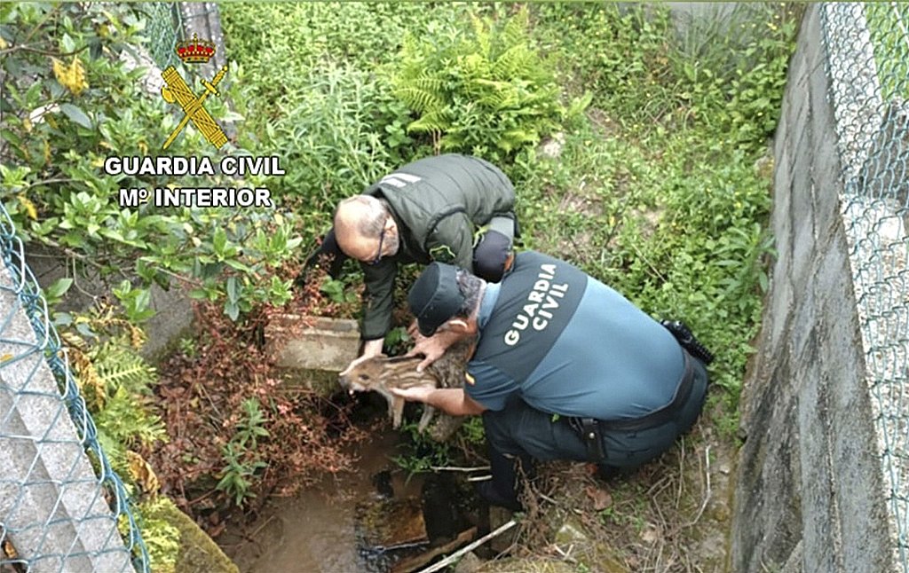 A las 9:35 horas del pasado domingo la Guardia Civil de Gondomar tuvo conocimiento por la llamada de un vecino de que había una cría de jabalí atascada en un tubo de agua en una calle de la parroquia de Camos, en Nigrán. En colaboración con un agente medioambiental de la Xunta de Galicia se procedió al auxilio del jabato, que se encontraba en una zona complicada para rescatarlo. El animal se recuperará en el Centro de Recuperación de Fauna Salvaje ubicado en Cotobade.