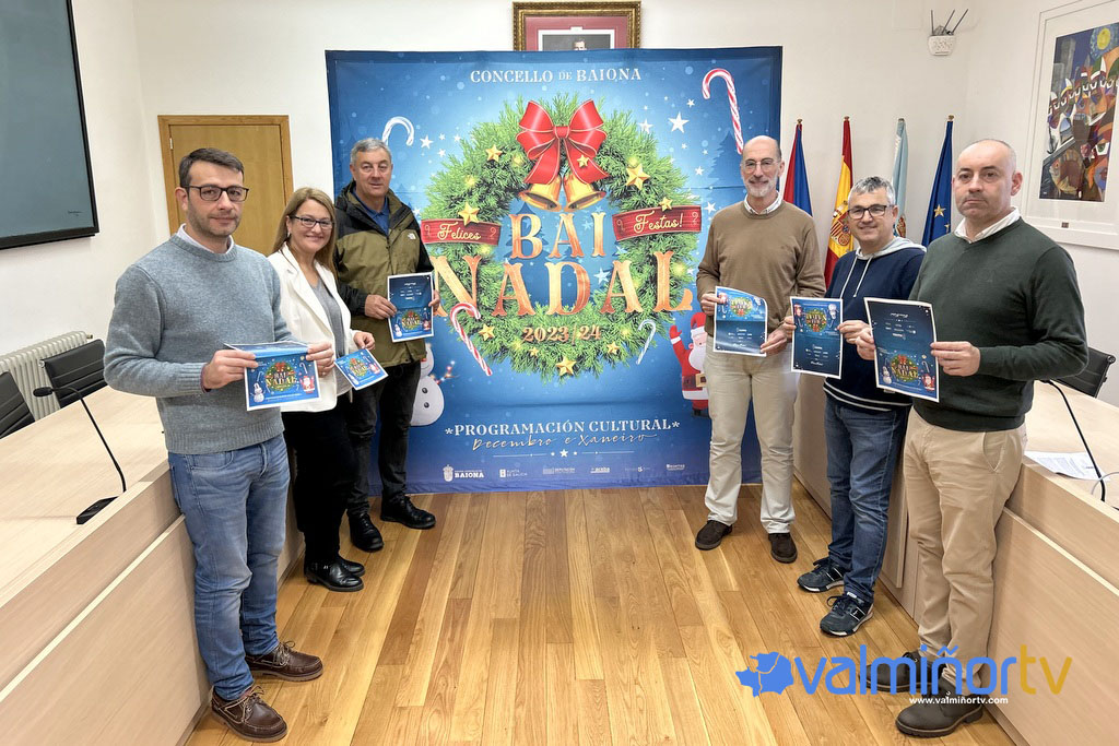 O Concello de Baiona, a través da Concellería de Festexos e a Concellería de Cultura, presentou este mañá no salón de plenos a programación organizada con motivo da campaña de Nadal “BaiNadal 2023-2024”, que contempla numerosas actividades culturais e de lecer para públicos de todos os gustos e todas as idades. O Alcalde, Jesús Vázquez Almuiña, e a Concelleira de Festexos, Ruth Álvarez González, acompañados por representantes de ACEBA (Asociación de Empresarios e Comerciantes de Baiona), e OVALMI, informaron o detalle da extensa e completa programación que recolle numerosas actividades especialmente pensadas para o público infantil, sendo un dos seus principais obxectivos contribuír á dinamización das zonas comerciais da vila para fomentar as compras do Nadal e o consumo nos comercios e establecementos baioneses. Unha programación “na que puxemos todo o noso esforzo e agarimo”.